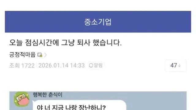 [유머이슈] 월급 200만원 받고 사장 심부름만하다 퇴사 선언 작성자 Mini's 등록일 2026-01-16 조회수 7 2026-01-16 유머이슈~♡ 월급 200만원 받고 사장 심부름만하다 퇴사 선언부산 사람이 말하는 부산 여행 꿀팁연애 고수들만 알아듣는다는 여자들 표현성냥팔이 소녀가 나올 수밖에 없었던 가혹한 시대배경훌쩍훌쩍 월급의 반을 햄버거먹는데 쓴사람.jpg당근 알바.. 26평집 청소 부탁드려요출근중에 여직원 전화 받은 팀장의 최후,, 목록