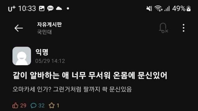 [유머이슈] 34년 전 한국에서 사진을 찍은 일본 여성 작성자 Mini's 등록일 2026-04-27 12:07:39.0 조회수 6 2026-04-27 유머이슈~♡ 34년 전 한국에서 사진을 찍은 일본 여성온몸에 문신있는 알바썰.jpg소개팅 다시는 안할거라는 블라남아내와 만나게 된 썰화들짝 놀란 딸의 다급함주민센터에서 짬처리 당하는 공무원 목록