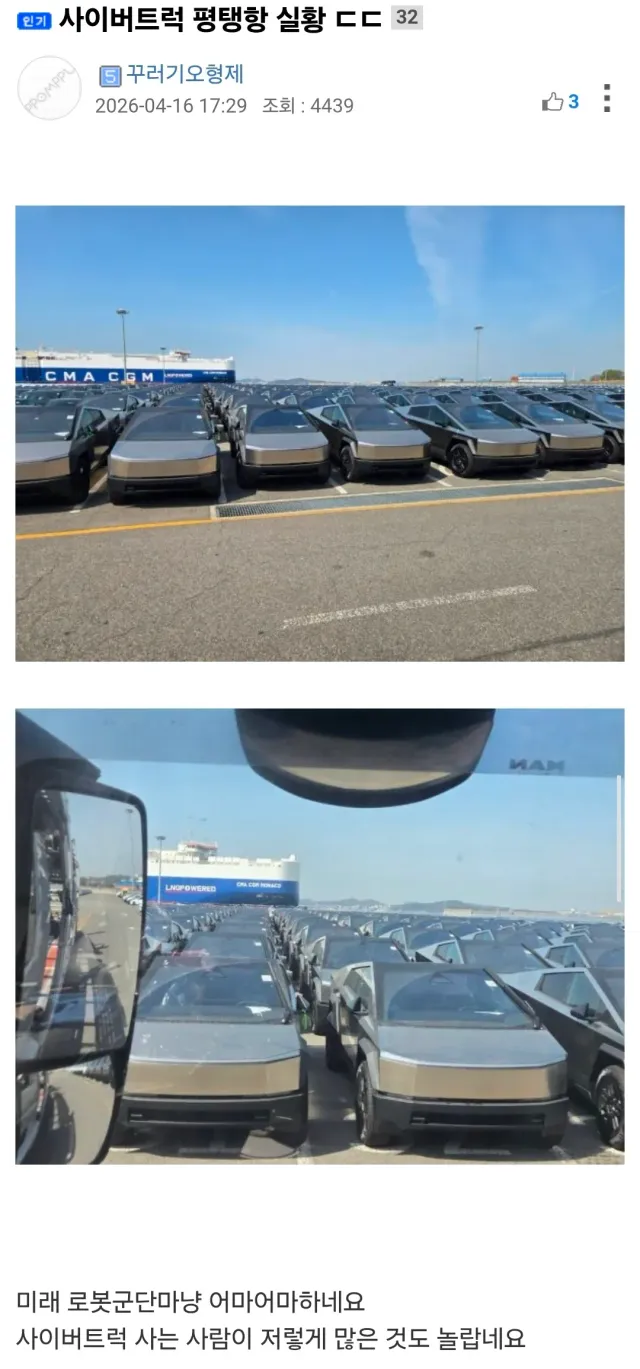 [유머이슈] 테슬라 사이버 트럭 평택항 실황 작성자 Mini's 등록일 2026-04-18 07:07:22.0 조회수 12 2026-04-18 유머이슈~♡ 테슬라 사이버 트럭 평택항 실황화성에서 본 우주신랑을 3시간 동안 팼다고 고백한 여자 목록