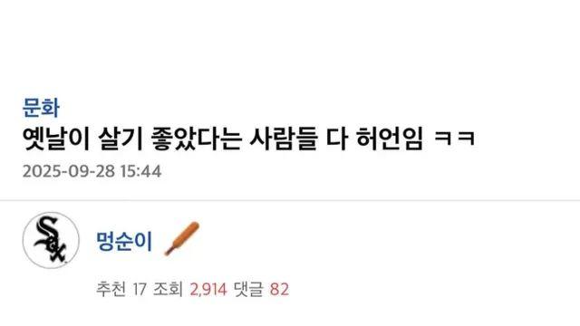 [유머이슈] 옛날에 살기 좋았다는 사람들 다 허언임 작성자 Mini's 등록일 2025-12-22 조회수 4 2025-12-22 유머이슈~♡ 옛날에 살기 좋았다는 사람들 다 허언임가끔 먹으면 은근히 맛있는 빵과자회사 다니면 깨닫게 되는 것들,,[감브주의] 친구가 제수씨 꼬셔서 결혼한 썰5억짜리 고래밥,, 목록