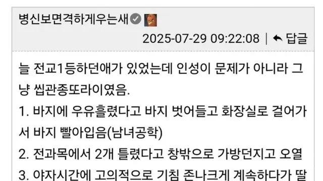 [유머이슈] 남미에서 강도당해도 쫓아가면 안되는 이유 ㄷㄷ 작성자 Mini's 등록일 2026-01-21 조회수 7 2026-01-21 유머이슈~♡ 남미에서 강도당해도 쫓아가면 안되는 이유 ㄷㄷ중학교때 최진실에게 팬레터를 보내고 답장받은 사람.jpg,,천하의 장원영도 소화하기 힘든 의상한국에서 태어나서 학폭 당하지 않은 고등학생.jpg,,미스테리한 아빠의 구두 사건.jpg 목록
